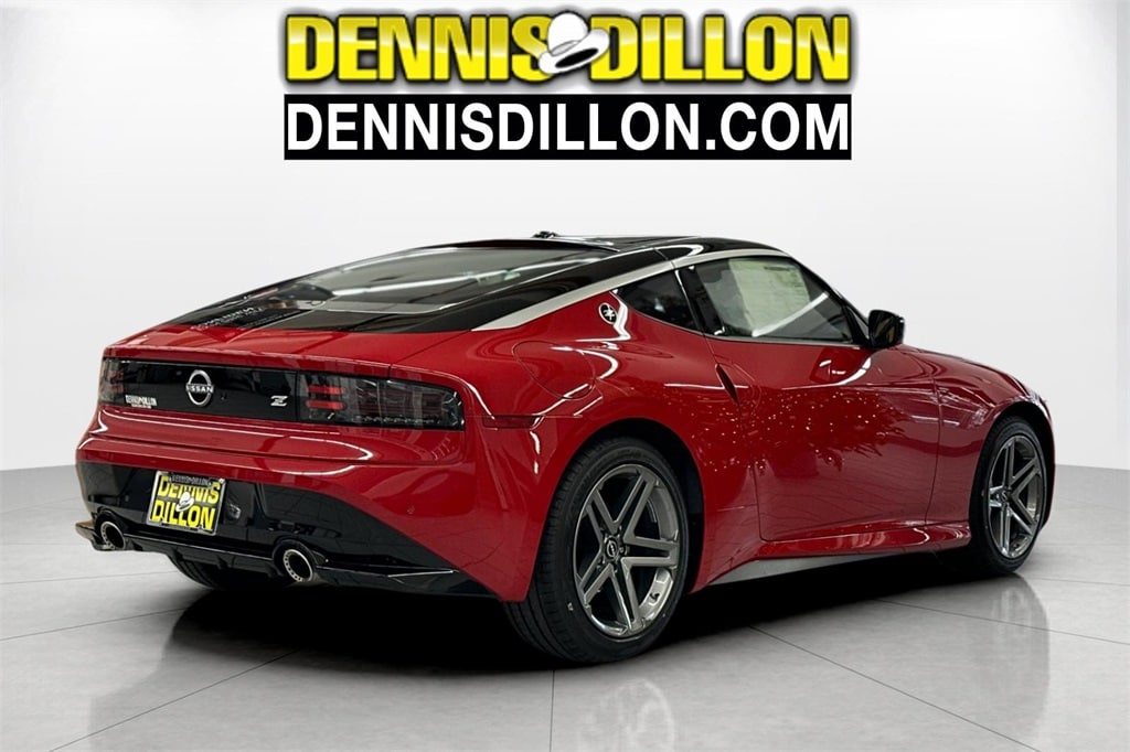Solid Red/Super Black 2025 Nissan Z Sport 2D Coupe RWD 6-Speed Manual 3.0L V6 4-Wheel Disc Brakes, 6 Speakers, ABS brakes, Air Conditioning, Alloy wheels, AM/FM radio: SiriusXM, Anti-whiplash front head restraints, Apple CarPlay/Android Auto, Auto High-beam Headlights, Auto-dimming Rear-View mirror, Automatic temperature control, Blind Spot Warning, Brake assist, Bumpers: body-color, Delay-off headlights, Driver door bin, Driver vanity mirror, Dual front impact airbags, Dual front side impact airbags, Electronic Stability Control, First Aid Kit, Floor Mat Package, Four wheel independent suspension, Front anti-roll bar, Front Bucket Seats, Front Center Armrest, Front reading lights, Fully automatic headlights, Leather Shift Knob, Leather steering wheel, Low tire pressure warning, Occupant sensing airbag, Outside temperature display, Overhead airbag, Panic alarm, Passenger door bin, Passenger vanity mirror, Power door mirrors, Power steering, Power windows, Radio data system, Radio: Nissan Audio w/6 Speakers, Rear anti-roll bar, Rear window defroster, Remote keyless entry, Security system, Speed control, Speed-sensing steering, Steering wheel mounted audio controls, Tachometer, Telescoping steering wheel, Tilt steering wheel, Traction control, Trip computer, Turn signal indicator mirrors, USB Charging Cable Set, Variably intermittent wipers, Voltmeter, Wheels: 18" x 9" Styled Alloy, Woven Cloth Seat Trim.
