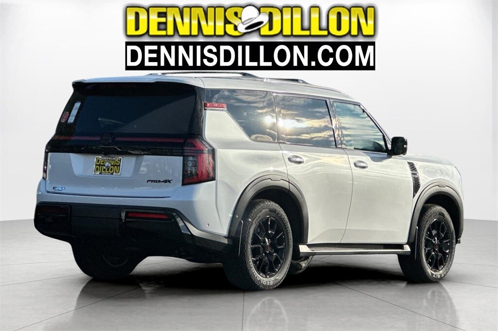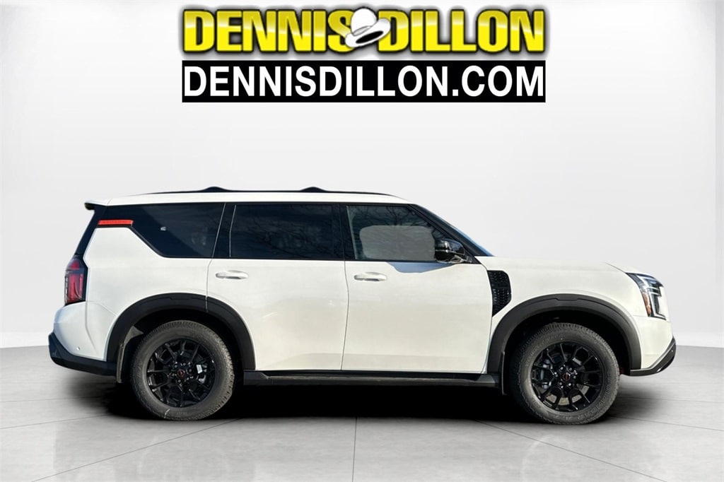 Aspen White Tricoat 2026 Nissan Armada PRO-4X 4D Sport Utility 4WD 9-Speed Automatic 3.5L DOHC 12 Speakers, 3rd row seats: split-bench, 4-Wheel Disc Brakes, ABS brakes, Adaptive suspension, Air Conditioning, Alloy wheels, AM/FM radio: SiriusXM w/360L, Anti-whiplash front head restraints, Apple CarPlay/Android Auto, Auto High-beam Headlights, Auto tilt-away steering wheel, Auto-dimming door mirrors, Auto-dimming Rear-View mirror, Auto-leveling suspension, Automatic temperature control, Biometric Cooling, Brake assist, Bumpers: body-color, Climate Controlled Heated and Ventilated Front Seats, Compass, Cross Bars, Delay-off headlights, Driver door bin, Driver vanity mirror, Dual front impact airbags, Dual front side impact airbags, Electronic Stability Control, Emergency communication system: NissanConnect Services, Four wheel independent suspension, Front anti-roll bar, Front Bucket Seats, Front Center Armrest, Front dual zone A/C, Front fog lights, Front reading lights, Fully automatic headlights, Garage door transmitter: myQ Connected Garage, Genuine wood dashboard insert, Hands-Free Power Liftgate, Heated 2nd Row Seats, Heated door mirrors, Heated Front Bucket Seats, Heated front seats, Heated steering wheel, HVAC memory, Illuminated entry, Illuminated Kick Plates, in-Car Camera, Intelligent Dash Cam, Intelligent Rear View Mirror (I-RVM), Knee airbag, Leather steering wheel, Low tire pressure warning, Memory seat, Navigation system: Google Maps, Occupant sensing airbag, Outside temperature display, Overhead airbag, Overhead console, Panic alarm, Panoramic Moonroof, Passenger door bin, Passenger vanity mirror, Power door mirrors, Power driver seat, Power Liftgate, Power passenger seat, Power steering, Power windows, Premium Paint, PRO-4X Carpeted Floor Mats with Bench Seat, Pro-4x Leather Quilted Insert Seat Trim, PRO-4X Mud Guards, PRO-4X Premium Package with Split Bench, Radio: NissanConnect with SiriusXM 360L, Rain sensing wipers, Rear air conditioning, Rear anti-roll bar, Rear Bumper Protector, Rear reading lights, Rear seat center armrest, Rear window defroster, Rear window wiper, Reclining 3rd row seat, Remote keyless entry, Security system, Speed control, Speed-sensing steering, Speed-Sensitive Wipers, Split folding rear seat, Spoiler, Steering wheel memory, Steering wheel mounted audio controls, Tachometer, Telescoping steering wheel, Tilt steering wheel, Traction control, Trip computer, Turn signal indicator mirrors, Variably intermittent wipers, Voltmeter, Wheels: 20" x 8.5J Painted PRO-4X Alloy.