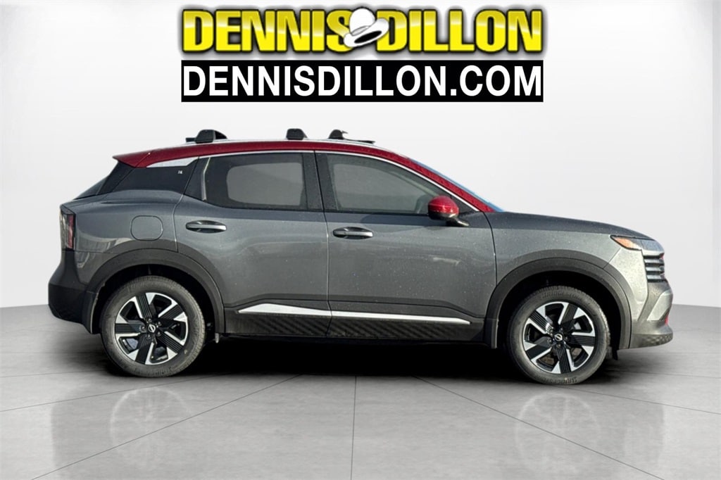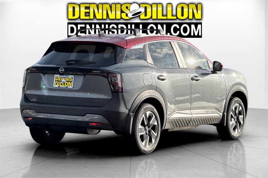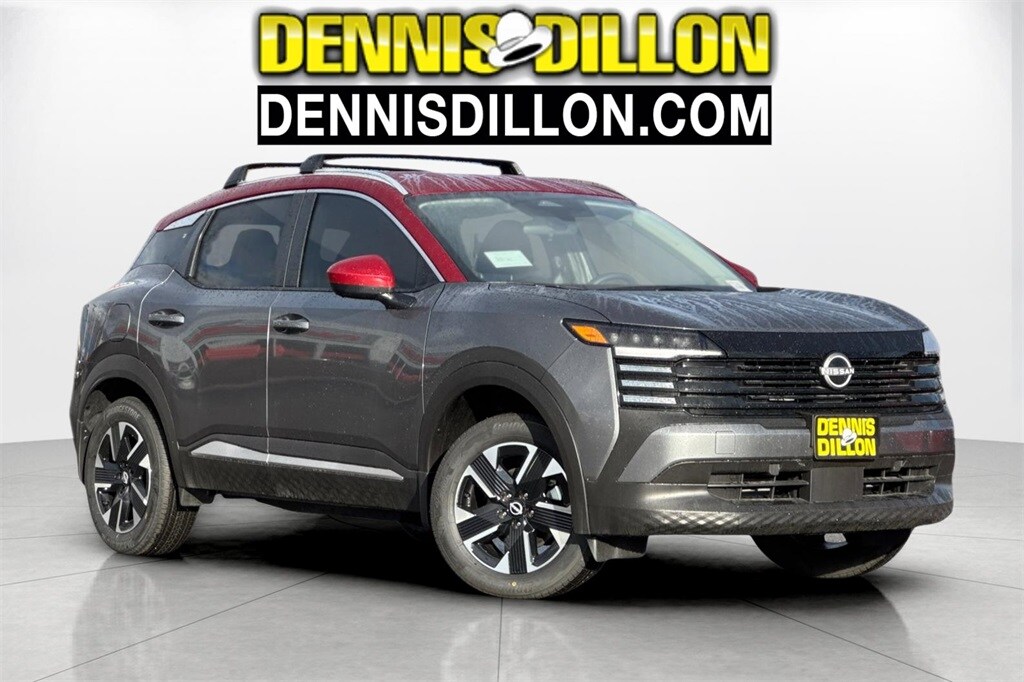 Gun Metallic/Scarlet Ember Tintcoat 2026 Nissan Kicks SV 4D Sport Utility AWD CVT with Xtronic 2.0L DOHC 17" Alloy Wheels, 2-Tone Paint, 4 Speakers, 4-Wheel Disc Brakes, ABS brakes, Air Conditioning, Alloy wheels, AM/FM radio, Auto High-beam Headlights, Automatic temperature control, AWD Cargo Mat, Blind Spot Warning, Brake assist, Bumpers: body-color, Carpeted Floor Mats, Charging Package, Cloth Seat Trim, Cold Weather Package, Crossbars, Driver door bin, Driver vanity mirror, Dual front impact airbags, Dual front side impact airbags, Electronic Stability Control, Emergency communication system, Exterior Parking Camera Rear, Four wheel independent suspension, Front anti-roll bar, Front Bucket Seats, Front Center Armrest, Front reading lights, Fully automatic headlights, Heated Front Seats, Heated Mirrors, Illuminated entry, Knee airbag, Low tire pressure warning, NissanConnect featuring Apple CarPlay and Android Auto, Occupant sensing airbag, Outside temperature display, Overhead airbag, Panic alarm, Passenger door bin, Passenger vanity mirror, Power door mirrors, Power steering, Power windows, Radio data system, Radio: AM/FM/SiriusXM Audio System, Rear anti-roll bar, Rear Floor Heater Ducts, Rear reading lights, Rear side impact airbag, Rear window defroster, Rear window wiper, Remote keyless entry, Security system, Speed control, Speed-sensing steering, Splash Guards, Split folding rear seat, Spoiler, Sport steering wheel, Steering wheel mounted audio controls, Tachometer, Telescoping steering wheel, Tilt steering wheel, Traction control, Trip computer, USB Charging Cable Set - Nissan, USB-C Power Delivery, Variably intermittent wipers.