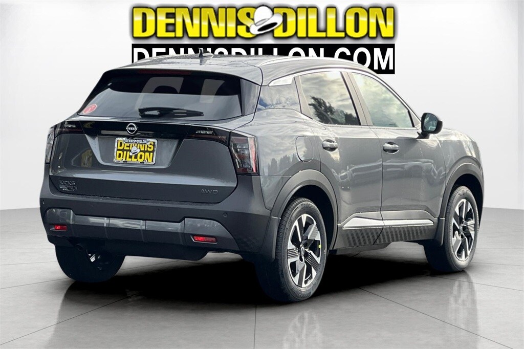 Gun Metallic 2026 Nissan Kicks SV 4D Sport Utility AWD CVT with Xtronic 2.0L DOHC 17" Alloy Wheels, 4 Speakers, 4-Wheel Disc Brakes, ABS brakes, Air Conditioning, Alloy wheels, AM/FM radio, Auto High-beam Headlights, Automatic temperature control, Blind Spot Warning, Brake assist, Bumpers: body-color, Carpeted Floor Mats, Cloth Seat Trim, Cold Weather Package, Driver door bin, Driver vanity mirror, Dual front impact airbags, Dual front side impact airbags, Electronic Stability Control, Emergency communication system, Exterior Parking Camera Rear, Four wheel independent suspension, Front anti-roll bar, Front Bucket Seats, Front Center Armrest, Front reading lights, Fully automatic headlights, Heated Front Seats, Heated Mirrors, Illuminated Driver & Passenger Sun Visors, Illuminated entry, Knee airbag, Low tire pressure warning, NissanConnect featuring Apple CarPlay and Android Auto, Occupant sensing airbag, Outside temperature display, Overhead airbag, Panic alarm, Panoramic Moonroof, Passenger door bin, Passenger vanity mirror, Power door mirrors, Power steering, Power windows, Radio data system, Radio: AM/FM/SiriusXM Audio System, Rear anti-roll bar, Rear Floor Heater Ducts, Rear reading lights, Rear side impact airbag, Rear window defroster, Rear window wiper, Remote keyless entry, Security system, Speed control, Speed-sensing steering, Splash Guards, Split folding rear seat, Spoiler, Sport steering wheel, Steering wheel mounted audio controls, Sunglass Holder, SV Premium Package, Tachometer, Telescoping steering wheel, Tilt steering wheel, Traction control, Trip computer, Variably intermittent wipers.