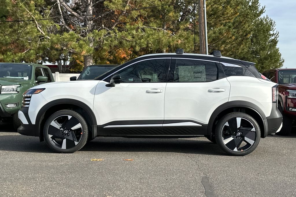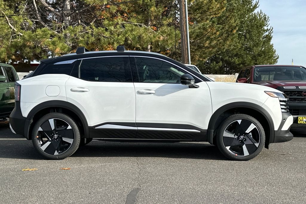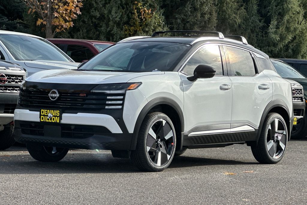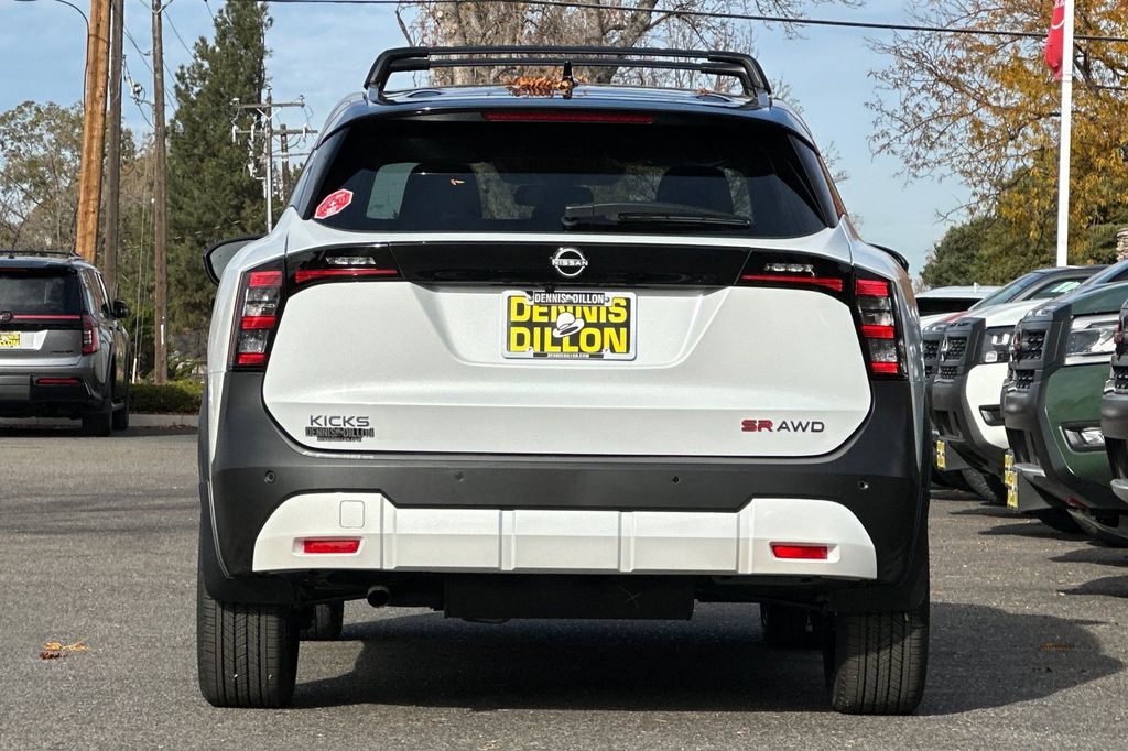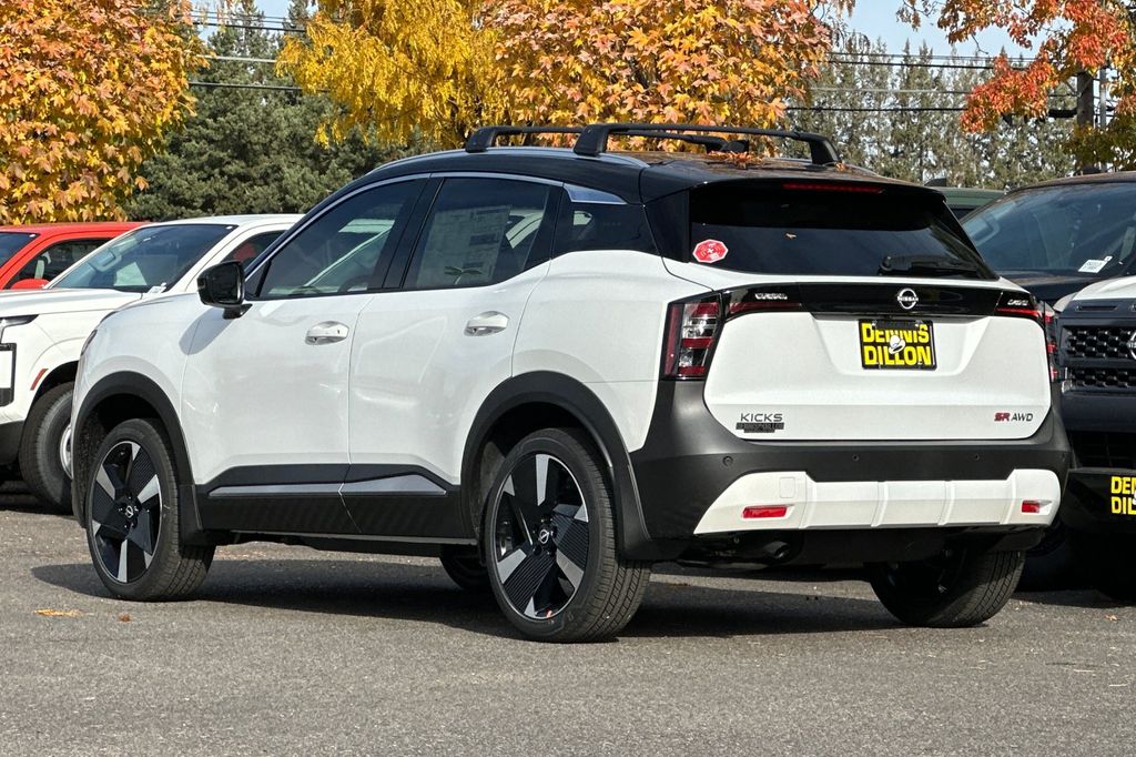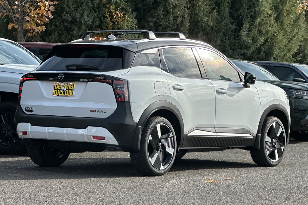 Aspen White Tricoat/Super Black 2026 Nissan Kicks SR 4D Sport Utility AWD CVT with Xtronic 2.0L DOHC 17" Alloy Wheels, 19" Alloy Wheels, 2-Tone Premium Paint, 4-Wheel Disc Brakes, 6 Speakers, ABS brakes, Air Conditioning, Alloy wheels, AM/FM radio, Auto High-beam Headlights, Automatic temperature control, Brake assist, Bumpers: body-color, Carpeted Floor Mats, Cold Weather Package, Crossbars, Delay-off headlights, Driver door bin, Driver vanity mirror, Dual front impact airbags, Dual front side impact airbags, Electronic Stability Control, Emergency communication system: NissanConnect Services, Exterior Parking Camera Rear, Four wheel independent suspension, Front anti-roll bar, Front Bucket Seats, Front Center Armrest, Front reading lights, Fully automatic headlights, Garage door transmitter: myQ Connected Garage, Heated Front Seats, Heated Mirrors, Illuminated entry, Knee airbag, Leather Shift Knob, Leather steering wheel, Low tire pressure warning, NissanConnect featuring Apple CarPlay and Android Auto, Occupant sensing airbag, Outside temperature display, Overhead airbag, Overhead console, Panic alarm, Passenger door bin, Passenger vanity mirror, Power door mirrors, Power steering, Power windows, Radio data system, Radio: AM/FM/SiriusXM Audio System, Rear anti-roll bar, Rear Floor Heater Ducts, Rear reading lights, Rear seat center armrest, Rear side impact airbag, Rear window defroster, Rear window wiper, Remote keyless entry, Security system, Speed control, Speed-sensing steering, Splash Guards, Split folding rear seat, Spoiler, Sport Leatherette w/Cloth Insert Seat Trim, Sport steering wheel, Steering wheel mounted audio controls, Tachometer, Telescoping steering wheel, Tilt steering wheel, Traction control, Trip computer, Turn signal indicator mirrors, Variably intermittent wipers.