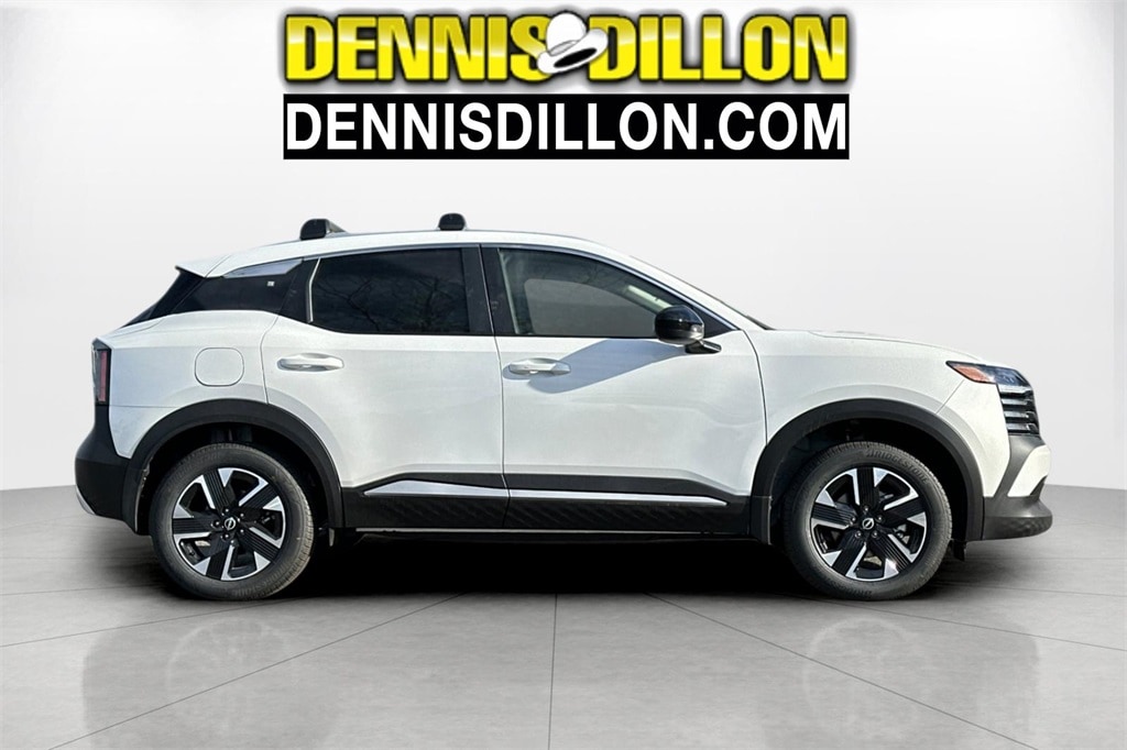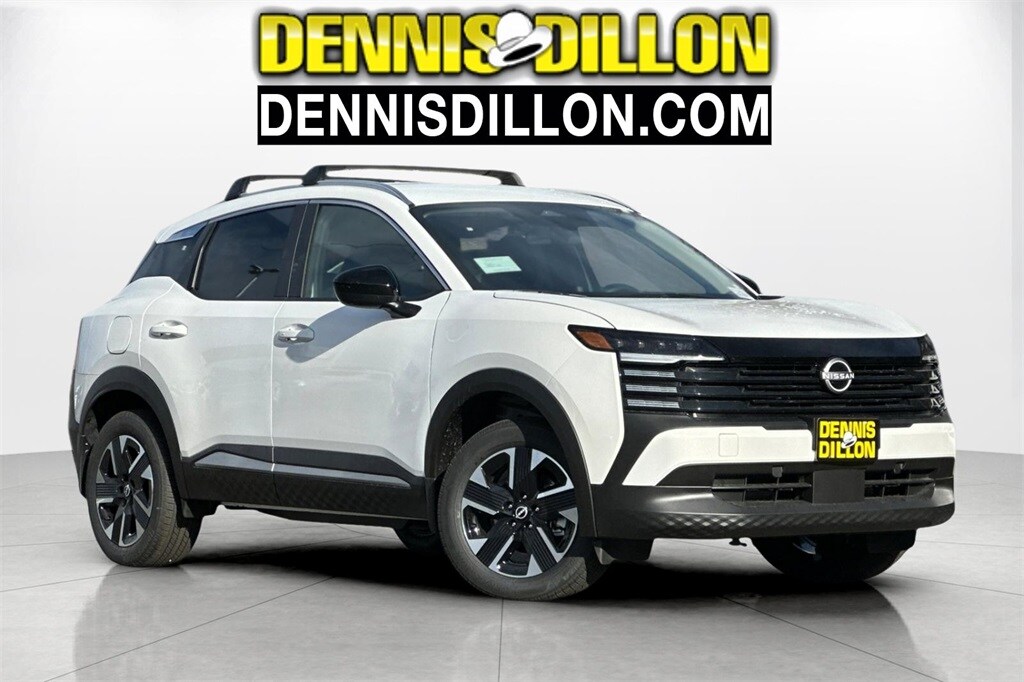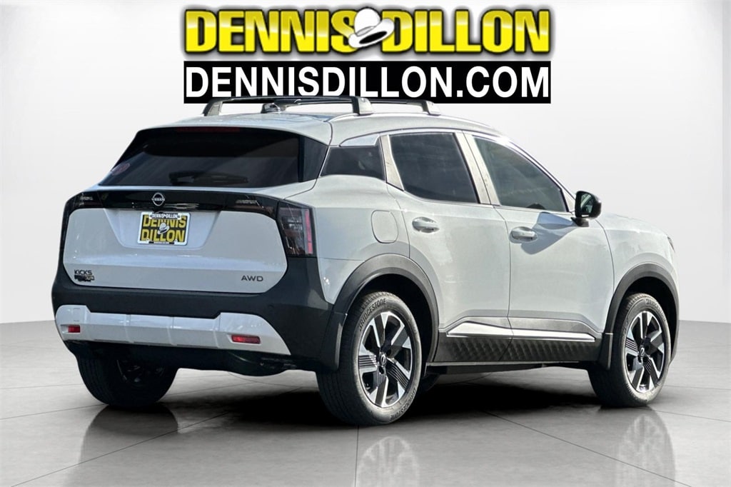 Aspen White Tricoat 2026 Nissan Kicks SV 4D Sport Utility AWD CVT with Xtronic 2.0L DOHC 17" Alloy Wheels, 4 Speakers, 4-Wheel Disc Brakes, ABS brakes, Air Conditioning, Alloy wheels, AM/FM radio, Auto High-beam Headlights, Automatic temperature control, Blind Spot Warning, Brake assist, Bumpers: body-color, Carpeted Floor Mats, Cloth Seat Trim, Cold Weather Package, Crossbars, Driver door bin, Driver vanity mirror, Dual front impact airbags, Dual front side impact airbags, Electronic Stability Control, Emergency communication system, Exterior Parking Camera Rear, Four wheel independent suspension, Front anti-roll bar, Front Bucket Seats, Front Center Armrest, Front reading lights, Fully automatic headlights, Heated Front Seats, Heated Mirrors, Illuminated entry, Knee airbag, Low tire pressure warning, NissanConnect featuring Apple CarPlay and Android Auto, Occupant sensing airbag, Outside temperature display, Overhead airbag, Panic alarm, Passenger door bin, Passenger vanity mirror, Power door mirrors, Power steering, Power windows, Premium Paint, Radio data system, Radio: AM/FM/SiriusXM Audio System, Rear anti-roll bar, Rear Floor Heater Ducts, Rear reading lights, Rear side impact airbag, Rear window defroster, Rear window wiper, Remote keyless entry, Security system, Speed control, Speed-sensing steering, Splash Guards, Split folding rear seat, Spoiler, Sport steering wheel, Steering wheel mounted audio controls, Tachometer, Telescoping steering wheel, Tilt steering wheel, Traction control, Trip computer, Variably intermittent wipers.