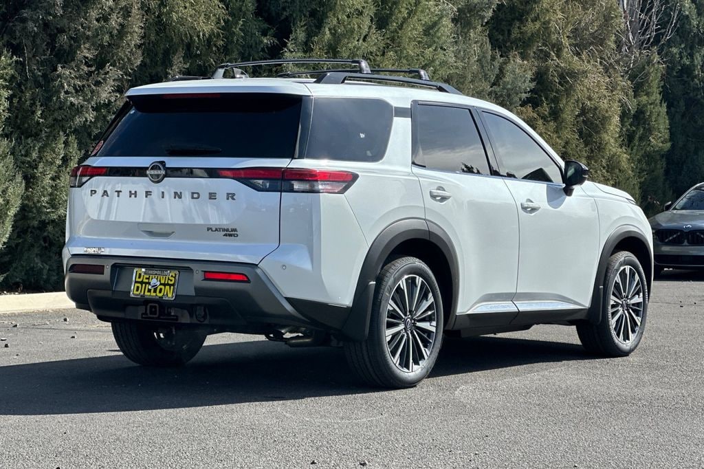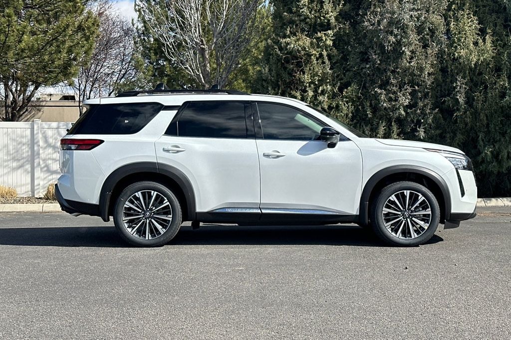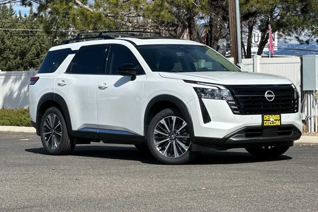 Everest White Pearl Tricoat 2026 Nissan Pathfinder Platinum 4D Sport Utility 4WD 9-Speed Automatic 3.5L V6 DOHC 13 Speakers, 3rd row seats: bench, 4-Piece Black Splash Guards, 4-Wheel Disc Brakes, ABS brakes, Air Conditioning, Alloy wheels, AM/FM radio: SiriusXM w/360L, Auto High-beam Headlights, Auto tilt-away steering wheel, Auto-dimming Rear-View mirror, Automatic temperature control, Bench Seat Carpeted Floor Mats, Bodyside moldings, Bose Premium Audio System, Brake assist, Bumpers: body-color, Cargo Area Protector, Cargo Net, Cargo Package, Climate Controlled Front Bucket Seats, Cross Bars, Delay-off headlights, Driver door bin, Driver vanity mirror, Dual front impact airbags, Dual front side impact airbags, Electronic Stability Control, Emergency communication system: NissanConnect Services, First Aid, Four wheel independent suspension, Front anti-roll bar, Front Bucket Seats, Front Center Armrest, Front dual zone A/C, Front reading lights, Fully automatic headlights, Garage door transmitter: HomeLink, Heads-Up Display, Heated door mirrors, Heated front seats, Heated rear seats, Heated steering wheel, Illuminated entry, Knee airbag, Low tire pressure warning, Memory seat, NissanConnect featuring Apple CarPlay and Android Auto, Occupant sensing airbag, Outside temperature display, Overhead airbag, Overhead console, Panic alarm, Passenger door bin, Passenger vanity mirror, Power door mirrors, Power driver seat, Power Liftgate, Power moonroof, Power passenger seat, Power steering, Power windows, Premium Paint, Radio data system, Radio: AM/FM Audio System with NissanConnect, Rain sensing wipers, Rear air conditioning, Rear anti-roll bar, Rear reading lights, Rear seat center armrest, Rear side impact airbag, Rear window defroster, Rear window wiper, Reclining 3rd row seat, Remote keyless entry, Security system, Semi-Aniline Leather-Appointed Seating Surfaces, Speed control, Speed-sensing steering, Speed-Sensitive Wipers, Split folding rear seat, Spoiler, Steering wheel memory, Steering wheel mounted audio controls, Tachometer, Telescoping steering wheel, Tilt steering wheel, Traction control, Trip computer, Turn signal indicator mirrors, Variably intermittent wipers, Ventilated front seats, Wheels: 20" Machined Alloy.