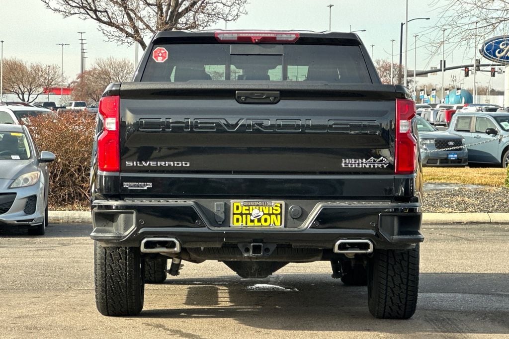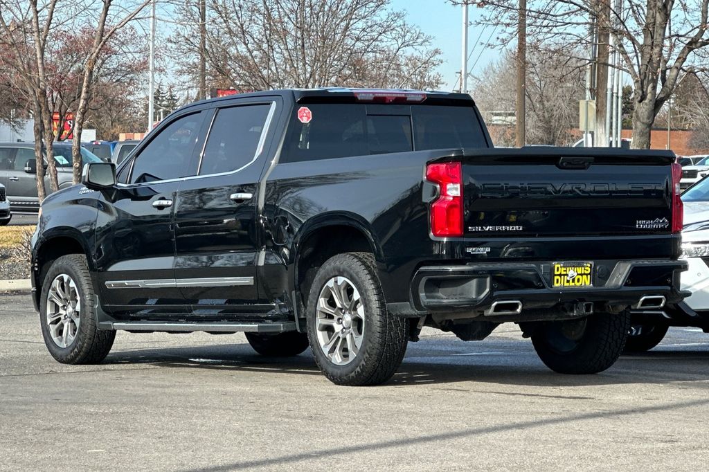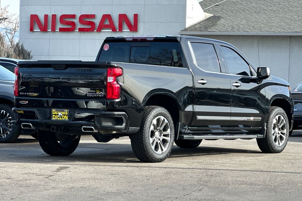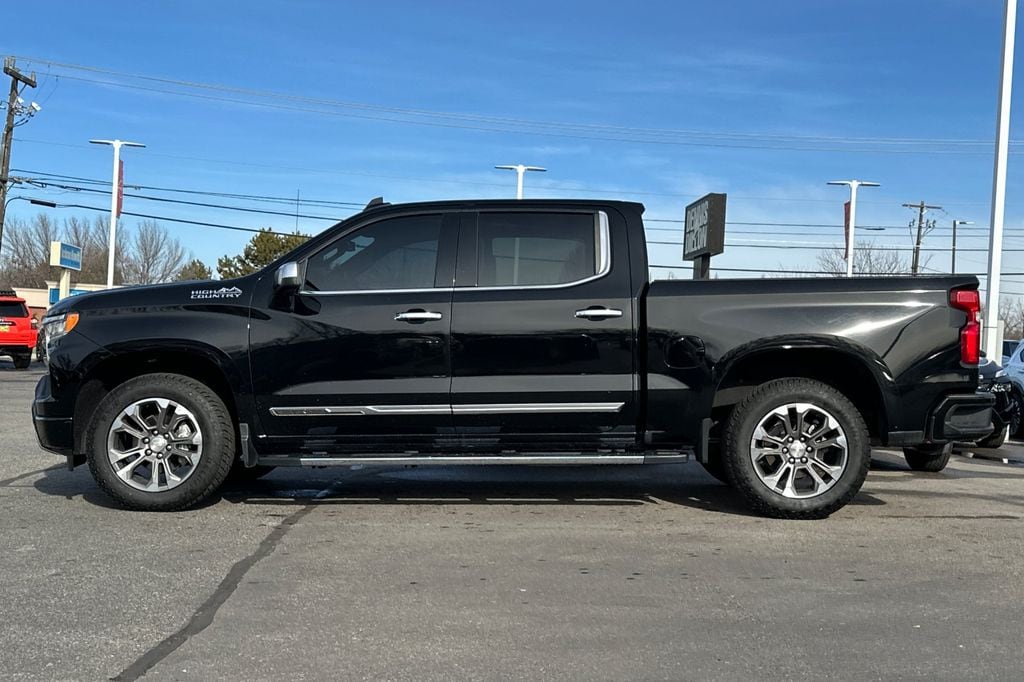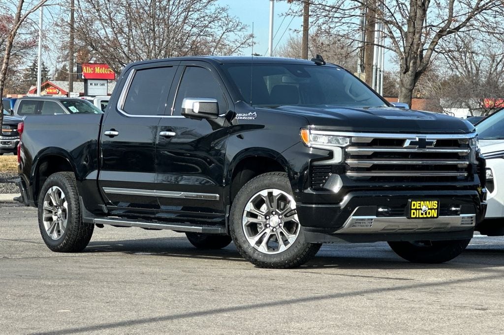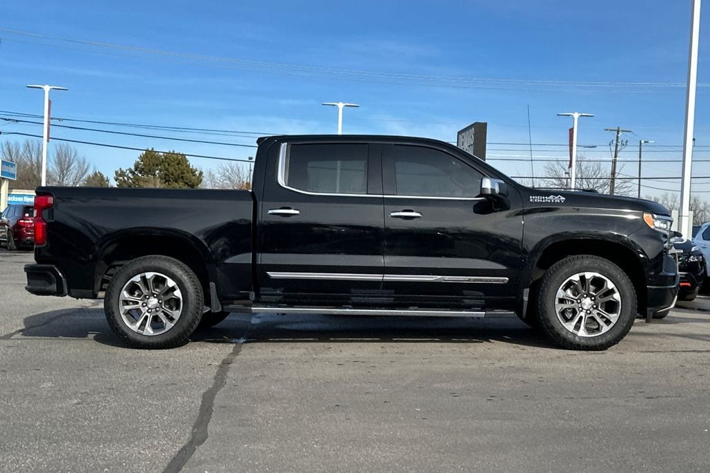 CARFAX One-Owner. Black 2022 Chevrolet Silverado 1500 High Country 4WD 10-Speed Automatic EcoTec3 5.3L V8 10-Way Power Driver Seat w/Lumbar, 10-Way Power Passenger Seat Adjuster w/Lumbar, 12.3" Multicolor Reconfigurable Digital Display, 120-Volt Bed Mounted Power Outlet, 120-Volt Instrument Panel Power Outlet, 170 Amp Alternator, 2 USB Data Ports, 2nd Row Heated Outboard Seats, 3.23 Rear Axle Ratio, 4-Wheel Disc Brakes, 7 Speakers, ABS brakes, Air Conditioning, Alloy wheels, AM/FM radio: SiriusXM with 360L, Apple CarPlay/Android Auto, Auto High-beam Headlights, Auto-dimming door mirrors, Auto-Dimming Inside Rear-View Mirror, Auto-dimming Rear-View mirror, Auto-Locking Rear Differential, Automatic Emergency Braking, Automatic temperature control, Bed View Camera, Bluetooth® For Phone, Body-Color Painted Mirror Caps, Bodyside moldings, Brake assist, Bumpers: body-color, Chevrolet Connected Access Capable, Chevytec Spray-On Black Bedliner, Chrome Assist Steps, Chrome Recovery Hooks, Color-Keyed Carpeting Floor Covering, Compass, Deep-Tinted Glass, Delay-off headlights, Driver door bin, Driver Memory, Driver vanity mirror, Dual Exhaust w/Polished Outlets, Dual front impact airbags, Dual front side impact airbags, Dual Rear USB Ports (Charge Only), Electric Rear-Window Defogger, Electrical Steering Column Lock, Electronic Cruise Control, Electronic Stability Control, Electronic Transmission Range Selector Shifter, Floor Mounted Center Console, Following Distance Indicator, Forward Collision Alert, Front anti-roll bar, Front Bucket Seats, Front Carpeted Floor Mats, Front Center Armrest, Front dual zone A/C, Front fog lights, Front LED Fog Lamps, Front License Plate Kit, Front Pedestrian Braking, Front Rainsensing Wipers, Front reading lights, Front wheel independent suspension, Fully automatic headlights, Garage door transmitter, Genuine wood console insert, Genuine wood dashboard insert, Genuine wood door panel insert, HD Surround Vision, Heated door mirrors, Heated Driver & Front Outboard Passenger Seats, Heated front seats, Heated rear seats, Heated Steering Wheel, Heated steering wheel, High Capacity Suspension Package, Hitch Guidance, Hitch Guidance w/Hitch View, Illuminated entry, Integrated Trailer Brake Controller, IntelliBeam Automatic High Beam On/Off, Keyless Open & Start, Lane Keep Assist w/Lane Departure Warning, Leather Wrapped Steering Wheel, LED Cargo Area Lighting, Low tire pressure warning, Memory seat, Not Equipped w/Dynamic Fuel Management, Not Equipped w/Front & Rear Park Assist, Not Equipped w/Steering Column Lock, Occupant sensing airbag, OnStar & Chevrolet Connected Services Capable, Outside Heated Power-Adjustable Mirrors, Outside temperature display, Overhead airbag, Overhead console, Panic alarm, Passenger door bin, Passenger vanity mirror, Perforated Leather Seat Trim, Perimeter Lighting, Power door mirrors, Power driver seat, Power Front Passenger Windows w/Express Up/Down, Power Front Windows w/Driver Express Up/Down, Power passenger seat, Power Rear Windows w/Express Down, Power Sliding Rear Window w/Rear Defogger, Power steering, Power Tailgate, Power Tilt & Telescoping Steering Column, Power windows, Preferred Equipment Group 3LZ, Premium audio system: Chevrolet Infotainment 3 Premium, Premium Bose 7-Speaker Sound System, Radio data system, Radio: Chevrolet Infotainment 3 Premium System, Rain sensing wipers, Rear Carpeted Floor Mats, Rear Cross Traffic Alert-Braking, Rear Pedestrian Detection, Rear reading lights, Rear seat center armrest, Rear step bumper, Rear Wheelhouse Liners, Rear window defroster, Remote keyless entry, Remote Vehicle Starter System, Safety Alert Seat, Security system, SiriusXM w/360L, Speed control, Speed-sensing steering, Split folding rear seat, Standard Tailgate, Steering Wheel Audio Controls, Steering wheel mounted audio controls, Tachometer, Telescoping steering wheel, Theft Deterrent System (Unauthorized Entry), Tilt steering wheel, Traction control, Trailer Camera Provi