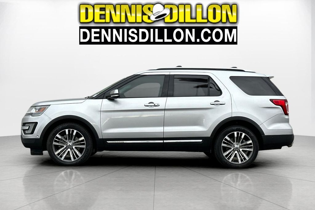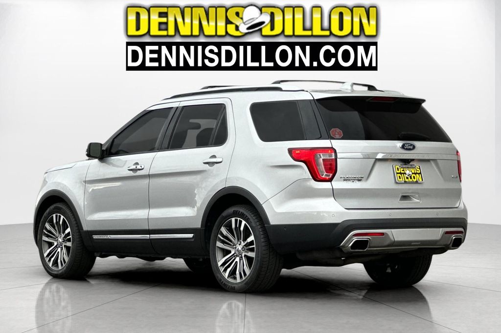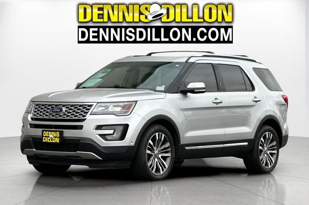 Ingot Silver 2017 Ford Explorer Platinum 4WD 6-Speed Automatic with Select-Shift 3.5L V6 12 Speakers, 3.16 Axle Ratio, 3rd row seats: split-bench, 4-Wheel Disc Brakes, ABS brakes, Adjustable pedals, Air Conditioning, Alloy wheels, AM/FM radio: SiriusXM, Auto High-beam Headlights, Auto tilt-away steering wheel, Auto-dimming door mirrors, Auto-dimming Rear-View mirror, Automatic temperature control, Brake assist, Bumpers: body-color, CD player, Compass, Delay-off headlights, Driver door bin, Driver vanity mirror, Dual front impact airbags, Dual front side impact airbags, Electronic Stability Control, Emergency communication system: SYNC 3 911 Assist, Equipment Group 600A, Exterior Parking Camera Rear, Four wheel independent suspension, Front & Rear Floor Liners, Front anti-roll bar, Front Bucket Seats, Front Center Armrest, Front dual zone A/C, Front fog lights, Front reading lights, Fully automatic headlights, Garage door transmitter, Genuine wood dashboard insert, Genuine wood door panel insert, Heated door mirrors, Heated front seats, Heated rear seats, Heated steering wheel, Illuminated entry, Knee airbag, Lane Departure Warning System, Leather steering wheel, Low tire pressure warning, Memory seat, Navigation System, Nirvana Multi Contour Leather Cooled Bucket Seats, Occupant sensing airbag, Outside temperature display, Overhead airbag, Overhead console, Panic alarm, Passenger door bin, Passenger vanity mirror, Pedal memory, Power door mirrors, Power driver seat, Power Liftgate, Power moonroof, Power passenger seat, Power steering, Power windows, Premium audio system: Sony, Radio data system, Radio: Premium Sound from Sony, Rain sensing wipers, Rear air conditioning, Rear anti-roll bar, Rear reading lights, Rear seat center armrest, Rear window defroster, Rear window wiper, Remote keyless entry, Roof rack: rails only, Security system, Speed control, Speed-sensing steering, Speed-Sensitive Wipers, Split folding rear seat, Spoiler, Steering wheel memory, Steering wheel mounted audio controls, SYNC 3 Communications & Entertainment System, Tachometer, Telescoping steering wheel, Tilt steering wheel, Traction control, Trip computer, Turn signal indicator mirrors, Variably intermittent wipers, Ventilated front seats, Wheels: 20" Bright Machined Face Aluminum.