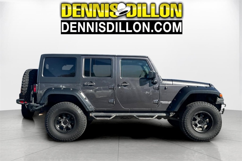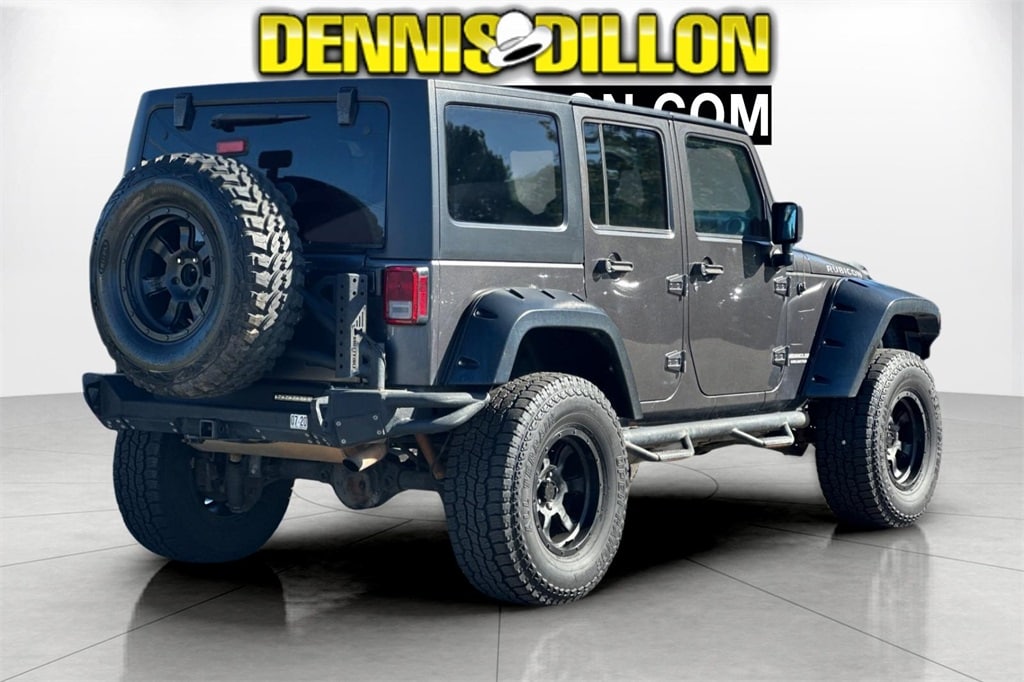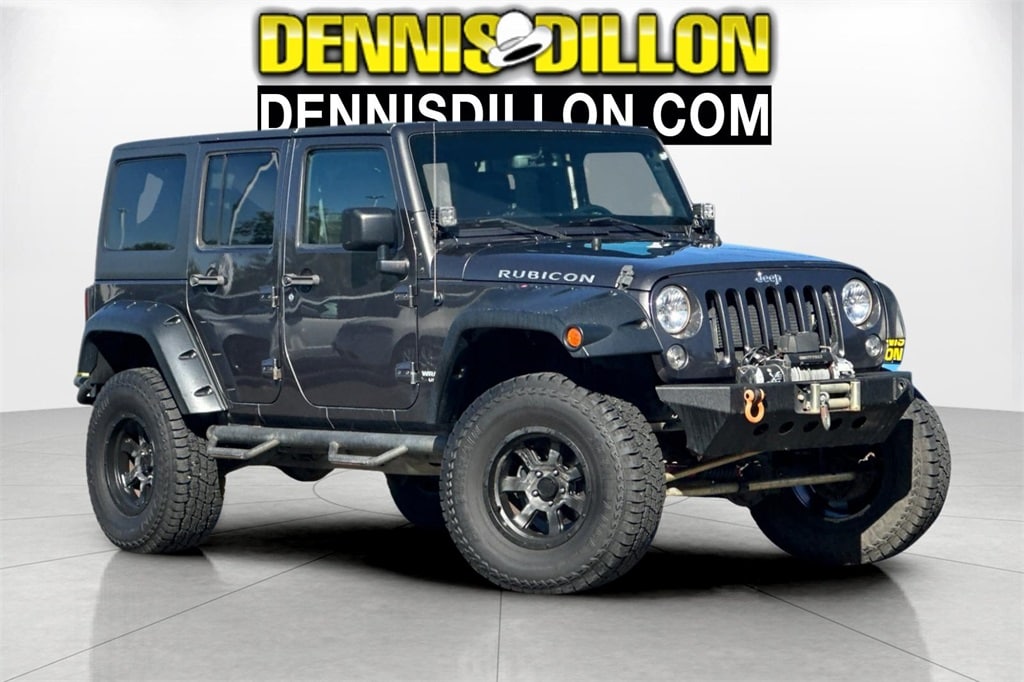 Clean CARFAX. Gray 2014 Jeep Wrangler Unlimited Rubicon 4WD 5-Speed Automatic 3.6L V6 24V VVT 17" x 7.5" Polished Mineral Gray Wheels, 3.73 Rear Axle Ratio, 4-Wheel Disc Brakes, 7 Speakers, ABS brakes, Air Conditioning, Alloy wheels, AM/FM radio, Audio Jack Input for Mobile Devices, Auto-dimming Rear-View mirror, Brake assist, CD player, Cloth Bucket Seats, Compass, Driver door bin, Driver vanity mirror, Dual front impact airbags, Electronic Stability Control, Front anti-roll bar, Front Bucket Seats, Front Center Armrest w/Storage, Front fog lights, Front reading lights, Fully automatic headlights, Heated door mirrors, Illuminated entry, Integrated roll-over protection, Leather steering wheel, Low tire pressure warning, Occupant sensing airbag, Outside temperature display, Panic alarm, Passenger door bin, Passenger vanity mirror, Performance Suspension, Power door mirrors, Power steering, Power windows, Radio data system, Radio: Uconnect 130 AM/FM/CD/MP3, Rear anti-roll bar, Remote keyless entry, Security system, Speed control, Split folding rear seat, Steering wheel mounted audio controls, Sunrider Soft Top, Tachometer, Tilt steering wheel, Traction control, Trip computer, Variably intermittent wipers.