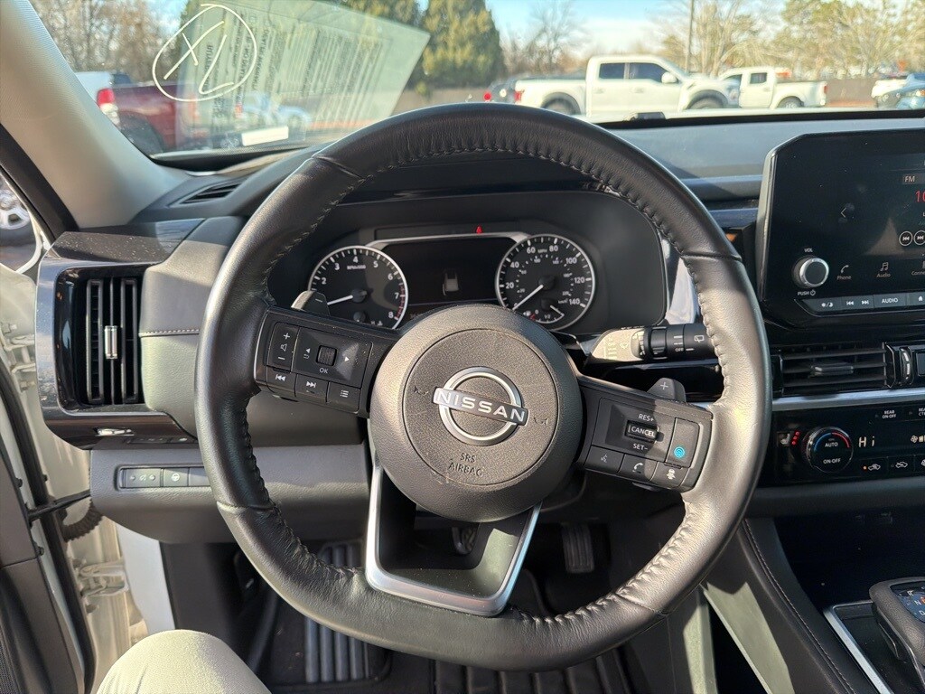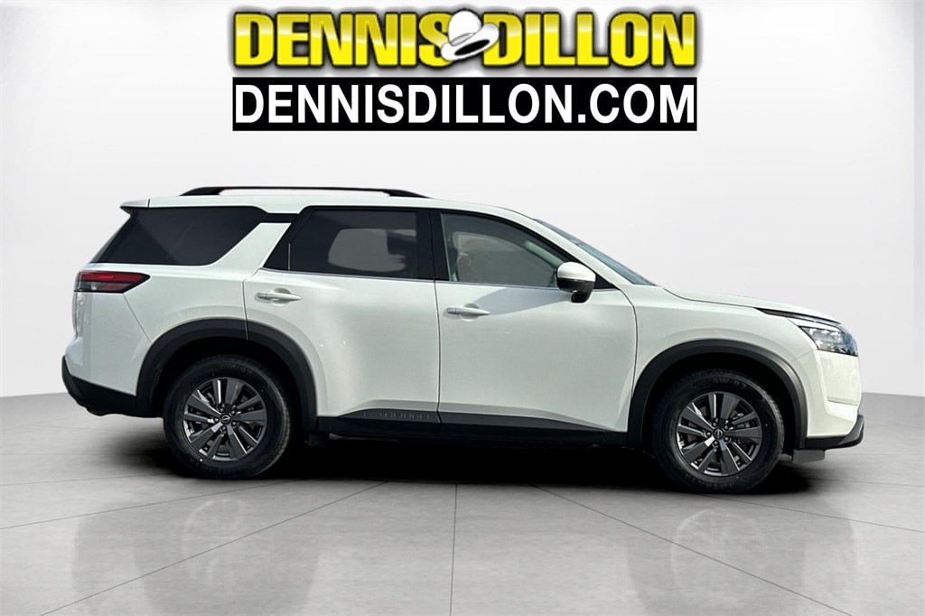 Clean CARFAX. Glacier White 2024 Nissan Pathfinder SV 4WD 9-Speed Automatic 3.5L V6 DOHC 3rd row seats: bench, 4-Wheel Disc Brakes, 6 Speakers, ABS brakes, Air Conditioning, Alloy wheels, AM/FM radio: SiriusXM, Auto High-beam Headlights, Automatic temperature control, Axle Ratio: 4.334, Brake assist, Bumpers: body-color, Cloth Seating Surfaces, Delay-off headlights, Driver door bin, Driver vanity mirror, Dual front impact airbags, Dual front side impact airbags, Electronic Stability Control, Emergency communication system, Four wheel independent suspension, Front anti-roll bar, Front Bucket Seats, Front Center Armrest, Front dual zone A/C, Front reading lights, Fully automatic headlights, Heated door mirrors, Heated Front Bucket Seats, Heated front seats, Illuminated entry, Knee airbag, Leather steering wheel, Low tire pressure warning, NissanConnect featuring Apple CarPlay and Android Auto, Occupant sensing airbag, Outside temperature display, Overhead airbag, Overhead console, Panic alarm, Passenger door bin, Passenger vanity mirror, Power door mirrors, Power driver seat, Power steering, Power windows, Radio data system, Radio: AM/FM Audio System w/NissanConnect, Rear air conditioning, Rear anti-roll bar, Rear Parking Sensors, Rear reading lights, Rear seat center armrest, Rear side impact airbag, Rear window defroster, Rear window wiper, Reclining 3rd row seat, Remote keyless entry, Security system, Speed control, Speed-sensing steering, Split folding rear seat, Spoiler, Steering wheel mounted audio controls, Tachometer, Telescoping steering wheel, Tilt steering wheel, Traction control, Trip computer, Turn signal indicator mirrors, Variably intermittent wipers, Wheels: 18" x 8J Painted Alloy.